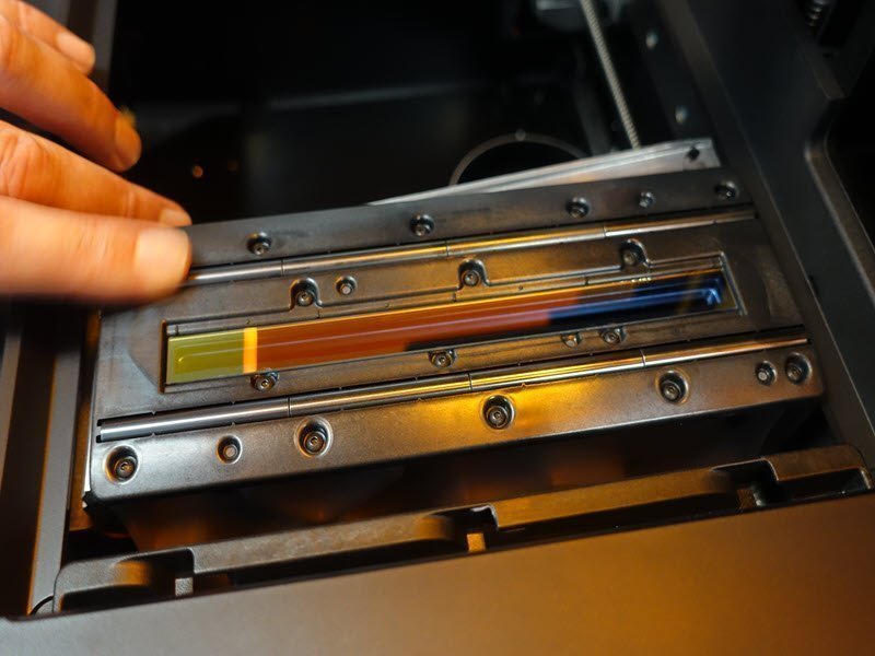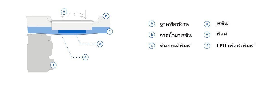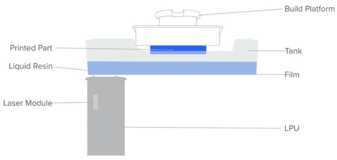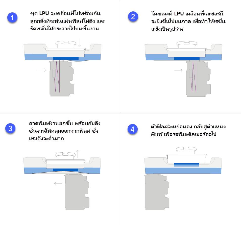 ด้านบนของ LPU หรือ Light Processing Unit จะมีแท่งกลมอยู่ตามแนวยาวทั้ง 2 ฝั่ง ซึ่งเจ้าแท่งกลมตัวนี้จะเป็นตัวดันฟิลม์ที่อยู่ในถาด ให้สูงขึ้น พร้อมกันกับที่เลเซอร์ยิงแสงลงไปที่เรซิ่น เมื่อ LPU เคลื่อนที่ออกจากจุดที่พิมพ์ เรซิ่นตรงส่วนนั้นก็จะแข็ง