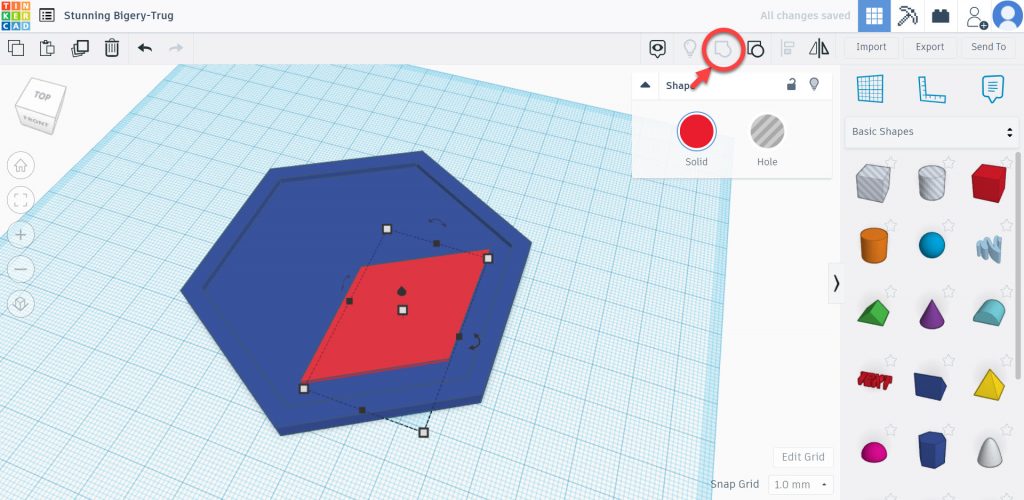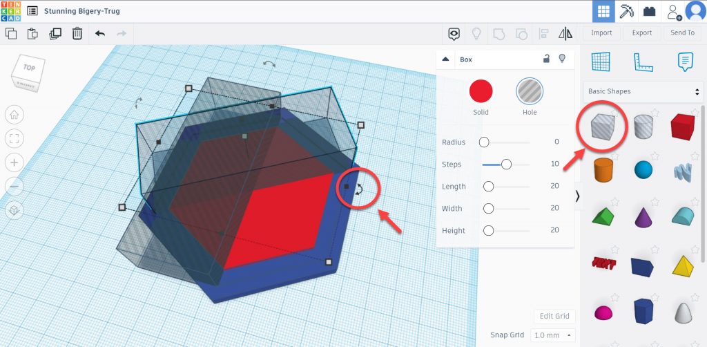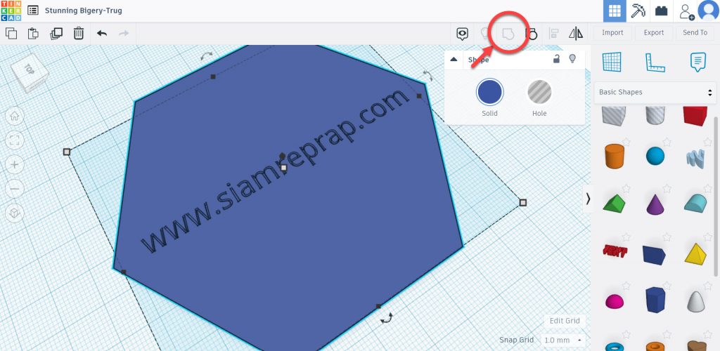 6.เมื่อได้ถาดทรง 6 เหลี่ยมแล้ว ผมต้องการโลโก้ สยาม เรปแรป ให้อยู่ตรงกลาง ผมจึงเพิ่มก้อน 6 เหลี่ยมขึ้นมาอีกก้อนเป็น solid แล้วเพิ่มก้อน 4 เหลี่ยม แล้วเลือกเป็น Hole ปรับขนาดตามแบบของโลโก้ จากนั้นกด Shift ค้าง แล้วเลือกทั้ง 3 ก้อน กด group เพื่อตัดเนื้อออกไปกลายเป็นรูปโลโก้ส่วนแรก ตามรูป