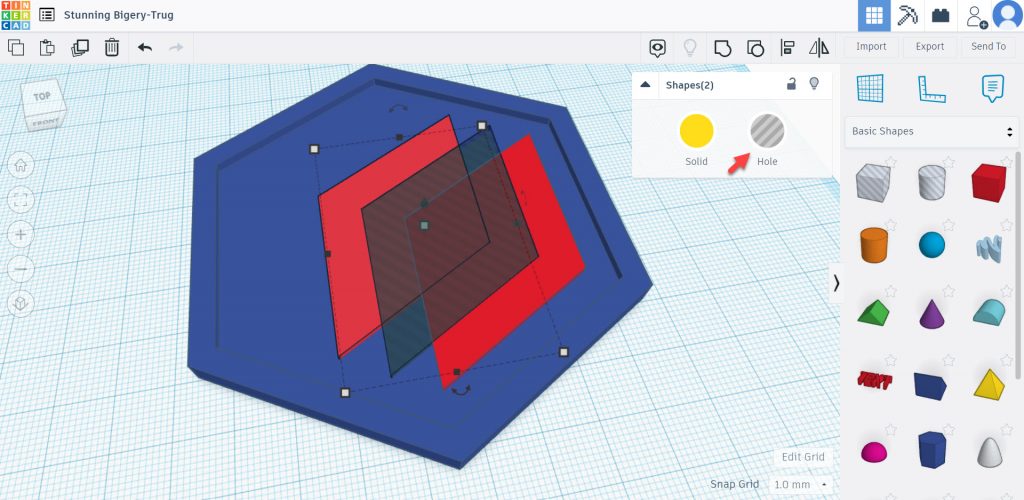 4. จากนั้นปรับขนาดความกว้างความสูงตามแบบ จนได้แผ่นรูป 6เหลี่ยมแบนๆ จากนั้นผมต้องการให้ถาดเป็นหลุมลึกลงไปนิดหน่อย ผมจึงเพิ่ม 6 เหลี่ยมไปอีกก้อน แล้วเอาไปซ้อนกับก้อนแรก โดยให้ก้อนที่ซ้อน มีขนาดเล็กกว่าก้อนแรก เล็กน้อย ทั้งด้านกว้าง ด้านยาว และด้านสูง เพื่อทำเป็นขอบ ซึ่งรูปหกเหลี่ยมก้อนนี้ผมต้องการเอาไป “ลบ” หรือ “ขุด” ออกจากก้อนเดิม ผมจึงเลือกก้อนนี้เป็นแบบ “Hole”