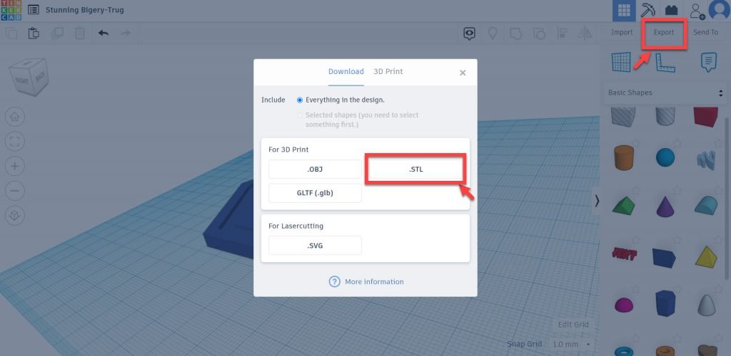 10. ทีนี้ผมต้องการเอาโมเดลที่เขียนขึ้นมาไปพิมพ์กับเครื่องปริ้น 3 มิติ ก็กดไปที่ Export แล้วเลือกเป็นไฟล์ .STL เพื่อเอาไปสั่งปริ้นในขั้นตอนถัดไป