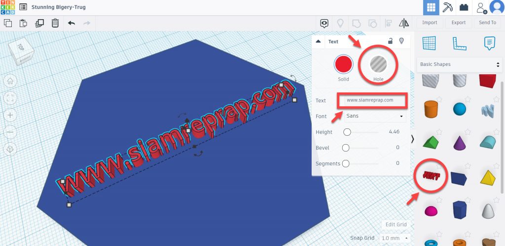 9. แถมอีกนึง ผมต้องการสลักตัวหนังสือใต้แผ่นรองแก้ว ผมก็จับหมุน 180องศา คว่ำหน้าลง จากนั้นกดที่เครื่องมือ TEXT แล้ววางลงบนแผ่นรองแก้ว ปรับแก้ text เป็น www.siamreprap.com แล้วเลือกเป็น Hole เพื่อเอาไปขุดเป็นร่องตัวหนังสือ แล้วจึงกด group เป็นอันเสร็จสิ้น