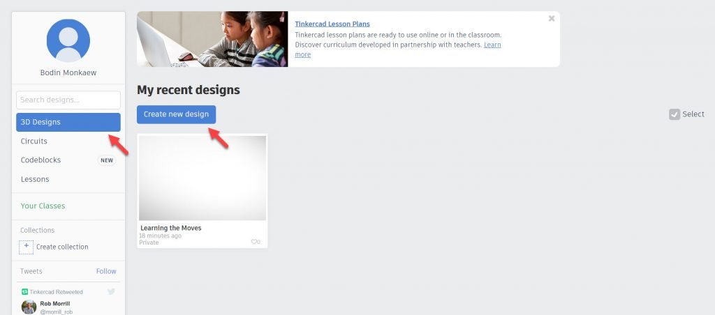 2. หลังจากที่สมัครเรียบร้อยแล้ว ที่หน้าแรก เข้าไปที่เมนู “3D Design” แล้วกด “Create new design” จะมาโผล่ไปหน้าเขียนแบบ3D หน้านี้เป็นเหมือนโต้ะที่ให้เราสามารถสร้างโมเดลบนนั้น โดยใช้เครื่องมือต่างๆในแถบด้านขวามือ