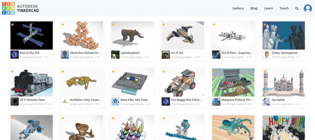 TinkerCAD มีในส่วนของหน้า Gallery of Things ซึ่งเป็นแหล่งรวมโมเดล 3D ที่ออกแบบด้วยโปรแกรม TinkerCAD ซึ่งผู้ออกแบบสามารถที่จะแบ่งบัน แชร์ผลงาน 3D ให้คนอื่น สามารถเข้าไปศึกษา ย้อนดูวิธีการเขียนได้ นอกจากนี้เรายังสามารถดึงไฟล์มาปรับแบบ โมดิฟาย คัสตอมให้เป็นงานแบบฉบับของเราเองก็ได้ รวมไปถึงไฟล์ที่ได้นั้น สามารถเอาไปพิมพ์กับเครื่องปริ้น 3D Printer ได้อย่างไม่มีปัญหา