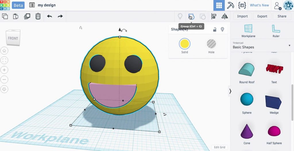 5.จากนั้นกดที่ “Group” เพื่อรวมทั้ง 2 ก้อนเข้าด้วยกัน ซึ่งการเลือกส่วนที่เป็น Hole จะเป็นการเอาเนื้อส่วนที่เป็น Solid ออกไปนั่นเอง ทำให้เกิดเป็นหลุมขี้นมา เพราะโมเดลที่ซ้อนมีขนาดเล็กกว่า ทำให้เหลือแต่ขอบกับกับด้านล่าง