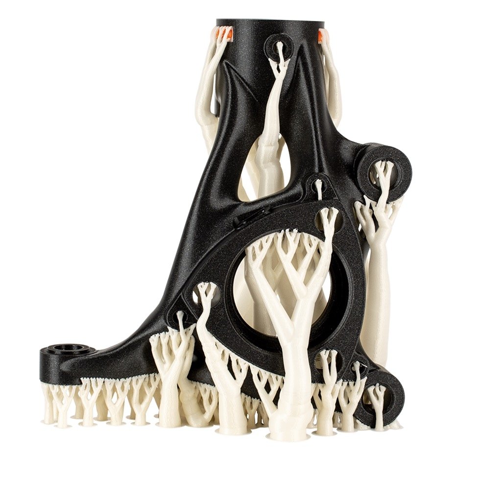 เครื่องพวกนี้ สามารถที่จะฉีดเส้นพลาสติกสลับไปมาได้ โดยที่ชิ้นงานให้เป็นพลาสติกธรรมดา ส่วน Support ก็ให้อีกเป็นเส้นพลาสติกแบบพิเศษ ที่ละลายน้ำ หรือเป็นแบบ Breakaway ที่แกะง่ายไม่ทิ้งรอย สำหรับเครื่องปริ้น 3D ที่ปริ้น Mult Material ได้ก็จะมี Prusa XL, Bambu Lab รุ่นที่เป็น Combo ที่มาพร้อมก้บกล่องสลับเส้นพลาสติก AMS แบบอัตโนมัติ
