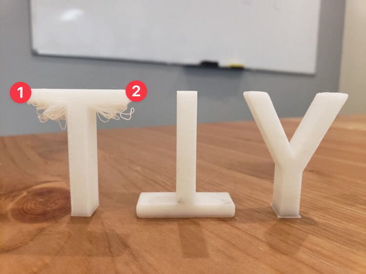 หลายๆ คน อาจจะยังไม่เคยเห็นหรือนึกไม่ออกว่ามันคือะไร หน้าตาเป็นยังไง โมเดลแบบไหนที่ต้องใช้ Support ผมขอให้นึกถึงตัวอักษรภาษาอังกฤษตัวใหญ่ ตัว Y ตัว H และ ตัว T แล้วลองนึกตามผมดู ถ้าผมจะพิมพ์โมเดล 3 มิติรูปตัว T โดยวางโมเดลตามรูปด้านล่าง ส่วนที่ยื่นออกมา ตามตำแหน่งที่ 1 และ 2 จะพิมพ์ไม่ได้ เพราะเวลาพิมพ์งานนั้น ส่วนที่ยื่นออกมาก พลาสติกก็จะย้อย หรือร่วงลงไปด้านล่าง ทำให้งานพิมพ์เสีย “เราเรียกส่วนที่ยื่นออกมาว่า Overhang” ดังนั้นจึงต้องมีการสร้างตัวรองรับหรือ Support ขึ้นมา